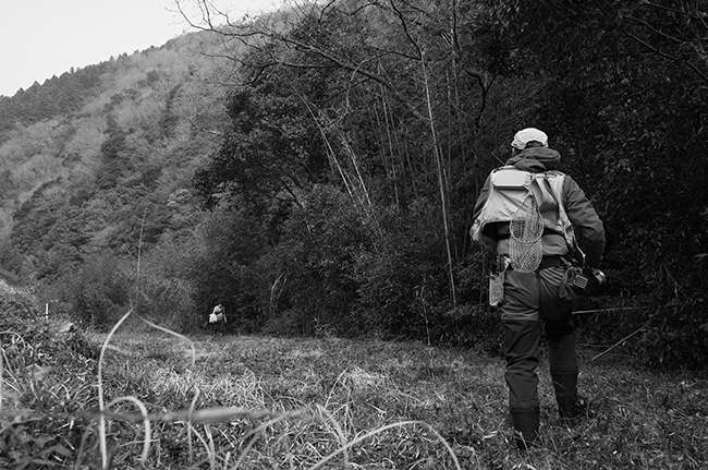 最後に支流をやってみようと行くと、目当ての場所に車。別の場所で僕は川に、Kくんは土手で山菜探し。