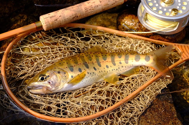 陽が傾きカゲロウがかなり飛んでいた。期待のポイントは何も出なかった。 諦めようかと思ったその時、上流の流れでライズした! 見間違いじゃない。キャストすると一発で出た。忘れかけていたヤマメの引きが伝わってきた。 土手に上がりKくんにヤマメの写真を見せると、Kくんは驚いて僕以上に喜んでいた。