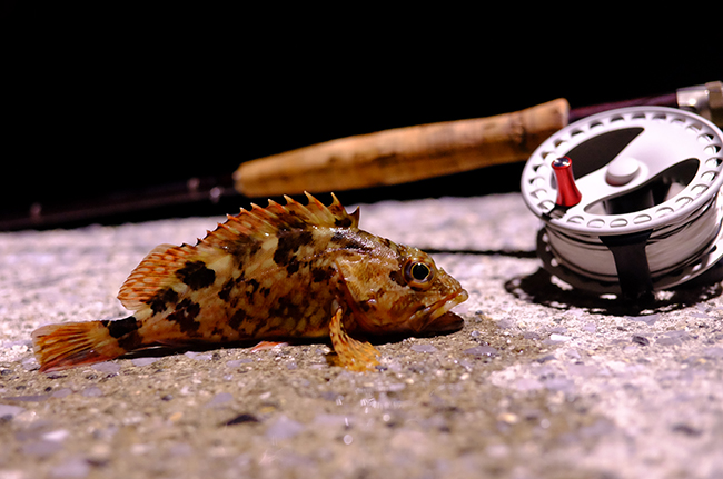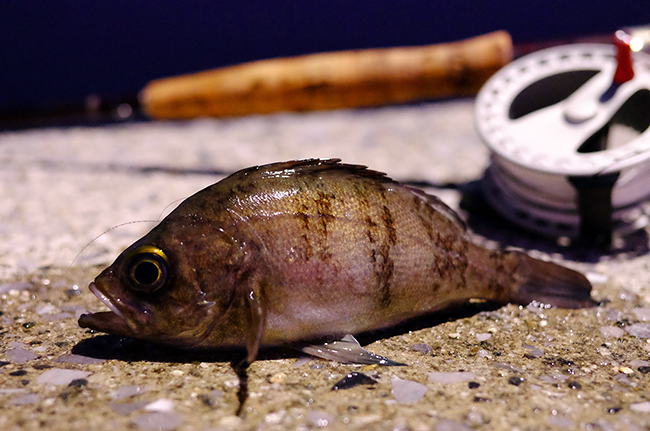 気がつくと東の空が明るくなり始めていた。こうなるとあとは早い。みるみる明るくなっていく。 蓄光フライに反応がないまま時間が過ぎたので、#24のプランクトンパターンに変えた。 すると早速来たが、チビメバルだった。しかしフライサイズを落とすと反応が良くなる。 さらに攻めるが、それから連続バイトが始まった。かかると全てチビメバル。活性は高い。 ゴボっと音がした。なんだろう?いや魚に違いないのだが、どのあたりだ?