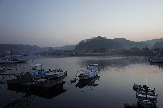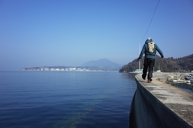 ということは良いサイズのメバルはもうここには居ないということだろう。 時刻を見ようと胸ポケットからスマホを取り出すと、生地を通過した汗で細かな水滴が付いていた。 いつの間にやらすっかりポカポカ陽気だ。 晴れ渡った島の港は遠くの景色がまるで春のように霞んでいた。 島の朝まづめ狙い、今年三回目。小潮の満潮八時半だから朝まづめ前後の潮は上げで悪くない。四時前に起きて出発。気温は三度。風はほぼ無風の予報だから着込んでおけば寒さは大丈夫だろう。手のかじかみだけは避けようがないけど。