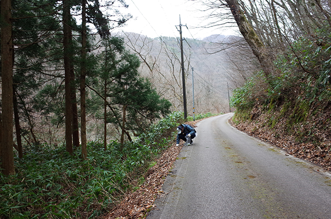 僕が春は山菜を採ると言っていたので、二人とも山菜を採ることにもかなり興味を示していた。この週末、あれこれ所用で日曜日だけ自由に動けるので、その日に二人を山菜採りに誘った。Y君はOKだったがK君は都合が合わずまたの機会ということになった。 日曜日は午後から天気が崩れる予報だったので、朝早くにY君に僕の家に来てもらい、そこからは僕の車で北部へと出発した。普段あまりアウトドアとは縁のないY君なので、途中の山の風景なども珍しそうだった。 なぜかアスファルトとの境目の窮屈な場所に出ている。